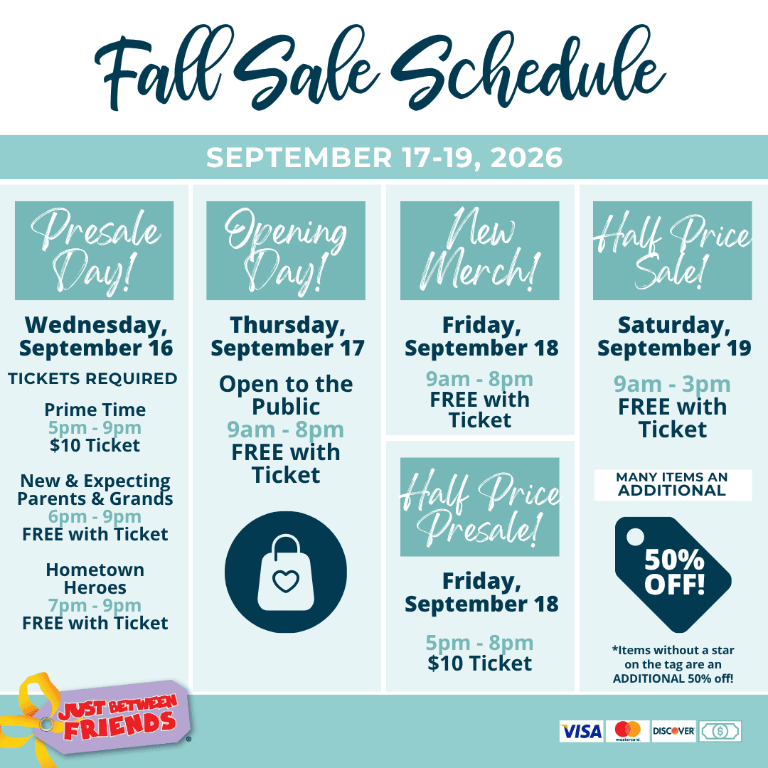 Shopping retail means hours in a mall with bored, crying kids—spending way more than you planned. And garage sales or social media buying can be disappointing and frustrating when items or connections aren't what you hoped they'd be. Shop Just Between Friends pop-up sales to save hundreds of dollars on new and gently-used clothes, toys, shoes, books and gear for all sizes—infant to teen, plus maternity—all in one place. Items are inspected for quality and safety which means great items at huge savings. You get stylish, confident, good-looking kids while saving money and time. That's smart!